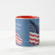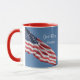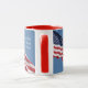 Röd, vit- och blåttmugg med amerikanska flaggan. En sida har "välsigna dig Amerika", och andra sidan har "landet av det fritt och hemmet av indiankrigaren.", Visa din patriotism med denna amerikanska flagganmugg! Få en matcha uppsättning för alla i hemmet eller kontoret. Dricka ditt tea eller kaffe från denna färgrika välsigna digAmerika mugg.