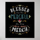 Vackra Beatitudes poster med handsbokstäver i stil, och dekorationer och accenter som omger typografi på mörkens bakgrund innefattar ord, "Blsed are the Merciful, eftersom de visas barmhärtighet". Den här älskade skriften är ett utdrag från Jesus sermon på berget i Gospelet Matthew, kapitel 5.