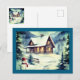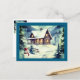 Detta julkort har en gammaldags akvarell av en liten stuga i skogen på vintern, det finns också en söt snöman som står strax utanför stugan.