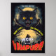 Vintagens fasa poster av filmen "Vampurrens natt". En svart katt med glansande gult ögon och fangs bared tar mittscenen mot mörk blått bakgrund. Katten framställs som en vampyr, med ett landskap och texten "Nine Lives..".. En mardröm omger den. Bakgrunden är en fullt, en kyrkogård och en silhuett av en person som springer iväg i rädsla.