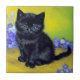 Tile med en svart katt i stil i Vincent van Gogh! Den här blåögda älsklingen sitter orubbligt med lila blommor mot en grönt och gult bord. En underbar gåva till kattälskare och nederländska konstsamlare!