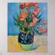 A vibrant arrangement of pink and red flowers sits in a detailed ceramic vase. The background features bold brushstrokes with a light blue hue.