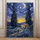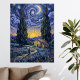 Add a touch of midnight magic to your home with Cypress Dusk, a breathtaking tribute to Post-Impressionist mastery. This canvas print features two iconic, towering cypress trees reaching toward a swirling indigo sky illuminated by a glowing crescent moon and radiant stars. Every line is rendered with thick, textured brushstrokes that capture the passionate energy of a Van Gogh original.