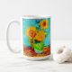 Coffee Mug featuring Vincent van Gogh’s still life painting depicting a bouquet of sunflowers in a green vase. Part of his initial version in the Arles Sunflowers series. A great gift for fans of flower paintings, Post-Impressionism, and Dutch art.