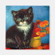 Magnet med en vacker Van Gogh tuxedo-katt! Den här lilla kattunge ligger intill ett basket av orange blommor på ett rött bord. En underbar gåva till kattälskare och nederländska konstsamlare!