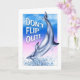 Kortets bild består av en delfin som gör en flip med texten "vänd inte ut!". Inuti texten: "Det är bara en födelsedag! Hoppas det är en lycklig" På baksidan av kortet visas roligtar om delfiner.