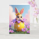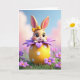 Designad med en söt, stiliserad kanin som tittar ut från ett överdimensionerat dekorerat ägg, centrerar detta kort kring stora mörka gnistrande ögon och en liten uppåtvänd leende som känns som en blyg hälsning 🐰. Ett ljust gult band sitter på huvudet, och rosiga kinder värmer upp den mjuka persikofärgade pälsen. Kaninen lutar sig framåt som om den delar en privat stund med betraktaren, vilket ger scenen en mild, vänlig närhet. Runt omkring den bildar lager av lila kronblad en blomliknande kapsel som öppnas som en bukett runt karaktären 🌷. Under det vilar en solig gul äggform prydd med små vita prickar på en prydlig fläck av rik grön gräs. All välkomsttext sitter nära toppen i en mjuk pastellton, med en mindre rad placer