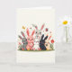 Det här kortet visar fem stiliserade kaniner tätt intill varandra på en grön gräsremsa 🐰. En större grå kanin sitter i mitten med rosa inneröron och en lugn, tillgiven blick som drar gruppen samman. På ena sidan lutar sig en pastellrosa kanin in som om den gav en försiktig kram, medan en vit kanin i närheten visar små rosa tassdynor, vilket ger ett sött, vänligt intryck. En slank svart kanin och en krämfärgad kanin fullbordar klustret, med rosiga kinder och stora ögon riktade mot varandra som nära vänner som delar en tyst stund 🐇. Bakgrunden är ljus och luftig, vilket låter de mjuka färgerna på kaninerna sticka ut mot vårbakgrunden. Små vilda blommor i rött, gult och rosa prickar grä
