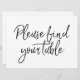 En stilfull, för hand skriven skylt som säger "Vänligen hitta ert bord"