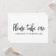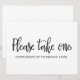 En enkel och vacker specialtillverkad "Vänligen ta en" vigselskylt med personlig text. Denna handskrivna skylt kan användas för att ge en modern stil på bröllopsmottagningen.