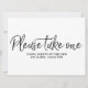 Ett stilrent, handskrivet välkomstskylt för bröllagsfavoriter "Please take one".