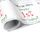 Denna personliga och anpassningsbara födelsedagsinpackningspappersdesign har ett meddelande som "Namn-Här, grattis på 1-årsdagen!", där namnet och födelsedagsnumret kan anpassas. Den har också dekorativa triangelformer. Bakgrunden är vit. Inpackningspapper som detta kan kanske användas för att slå in presenter som ges för att fira någon födelsedag. [~Z0000243]