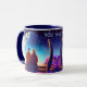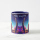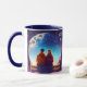 Mugg har ett par sitta på en bänk, omgiven av blommor och flygande fjärilar, på natten i månljuset och i himlar. Romantiskt motiv för älskare och bästa vänner. Lämpligt för många tillfälle - Alla hjärtans dag, hälsning för en flickvän eller pojkvän, fru eller make eller bara för att!