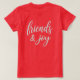 T-shirt har texten "Friends & Joy" i en flerfärgskonstruktion. Varje ord har en annan färg, vilket ger ett sunt och sjudande utseende. Du kan föreställa dig "Vänner" i klara, lekfulla färger, medan "Joy" använder djärvare och varmare toner. Sammandraget ("&") kan vara ett roligt element, kanske i en metallfärg eller en hjärtform