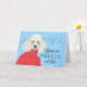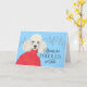 Vänskapens hälsningskort för en vän har ett klassvitt pudel med röd jacka med stadskontur i bakgrunden. Redo för Pudel av Roligt på omslaget. Art, bild och versell copyright © Shoaff Ballanger Studios, 2024.