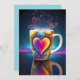 Ett dynamiskt mugg har en stor, färgstark hjärtutformning, med ett roterande mönster som sträcker sig till ångliknande former. De ljusa nyanserna skapar en glödande effekt mot mörkens bakgrund, med reflektioner som förbättrar den visuella effekten.