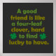 En bra vän är som en fyra löv-klöver: svår att hitta och lycklig att ha. Det finns ingenting jag inte skulle göra för dem som är mina vänners verkligen. Det finns inget som en verkligen lojal, pålitlig, bra vän. Den här textdesignen är perfekt för ordspråk och kloka citattecken älskare! Det ser underbart ut i det här teckensnittet och i färg. Det kan också vara en originell presentidé för jul och födelsedag! Om du vill ha det du ser kan du checka ut fler utformningar och alternativ. Håll dig säker och var god