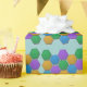 Sexhörliga former i blått, lila, grönt och orange mot ljusblå bakgrund.