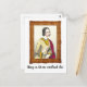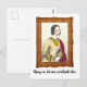 Det här vykortet innehåller en litografi över en kvinna som säger: "Vänta, låt mig tänka över det här."