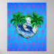 Surfingdesign för en surfare som rider en våg, inramad av tropiska handflatan träd. Havsblå bakgrund och rosa Hawaii Honu Sea Turtles och Tiki Mask mönster.