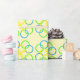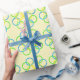 Överlappande ringar (blått, grönt, gult) replikeras fyra gånger och gult ringar är inspärrat i mitten. Det resulterande motivet replikeras över pappra med en bakgrund för blekens gult.