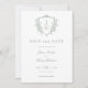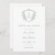 Den här Vapenskölden för Sage Grönt ReEmergency Blommigt Monogram Bröllop spara datum har en vapensköld i vintage stil som är dekorerad med Fransk Ro och klassiskt manusjus för namnen av bruden och trippen.