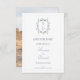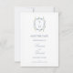 Blåblommor Monogram-Vapensköld Spara datumkortets Elegant och det delikata bröllop spara datum-kortet med en vapensköld på ett monogram som är försedd med delikata små blåa blommor och grön på vit bakgrund. Fotot par visas på baksidan.