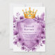 Den här exquisite bröllopsinbjudan innehåller ett royal guldfärgat krona, försett med ametystjuveler, kapslat ovanför en heraldisk sköld inramad i guld. Konstruktionen omges av lavare och violetta peonier, som skapar en lyxig blommigt i vintagen. Perfekt för romantiskt, royal-temat bröllop eller elegant firande med en gnutta skönhet och blommigt charm. Den tomma skölden ger utrymme för egna namn, data eller meddelanden.