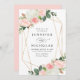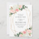 Bröllopbjudanden för blommigt i elegant som innehåller uppgifter om bröllop omgivna av en faux guld foil geometric ram med buketter av rosa ro och tulips med lush grönt och kopparlöv överst och grund i . Blommigtens bröllopsinbjudningar går tillbaka till en lätt rosa bakgrund. Designad för samordning med vår samling i bröllop vid Blommigten Vår.