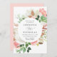 Bröllopbjudanden för blommigt i elegant med dina bröllop-uppgifter som omges av en blommigt ram av ro med rosa och tulpaner med lush grönt och kopparlöv. Blommigtens bröllopsinbjudningar går tillbaka till en lätt rosa bakgrund. Designad för samordning med vår samling i bröllop vid Blommigten Vår.