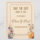En fantastisk bröllopsinbjudan till blommigten med pulserande orange, lila blommor och blå accenter på en mjuk gräddbakgrund. Perfekt för din speciella dag! Du får gärna reda på om du vill ha hjälp med att anpassa det här spara-the-date-kortet så att det stämmer överens med din unika vision.