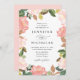 Bröllopbjudanden till blommigten i elegant med information om bröllop som är framtagen av rosa vattenfärgsro och tulpaner med lush grönt och kopparlöv. Blommigtens bröllopsinbjudningar går tillbaka till en lätt rosa bakgrund. Designad för samordning med vår samling i bröllop vid Blommigten Vår.