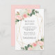 Snyggt, djurutrymmeskort i elegant bröllop med dina bröllop-uppgifter omgivna av ett faux guld-geometriskt ram med bindemedel av rosa ro och tulpaner med lush grönt och kopparlöv. Anpassa kortet genom att lägga till viktig information som hotellrum, bröllop webbplats, anvisningar osv.