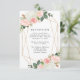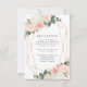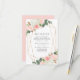 Snyggt, djurutrymmeskort i elegant bröllop med din bröllopsmottagningsinformation omgiven av ett faux guld geometriskt ram, med buketter av rosa vattenfärgsro och tulippar med lush grönt och kopparlöv. Anpassa kortet genom att lägga till viktig information, t.ex. mottagningsplats, tidpunkt osv.