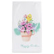 Den här designen har en terra cotta-blomkruka med vackra blommor i fullt. På arrangemang överst finns en liten gult baby chick. I bakgrunden finns det en stänk av en mint grönt färg. Texten "Glad påsk" kan vara personlig med ett särskilt tillfälle eller evenemang i namn.
