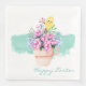 Den här designen har en terra cotta-blomkruka med vackra blommor i fullt. På arrangemang överst finns en liten gult baby chick. I bakgrunden finns det en stänk av en mint grönt färg. Texten "Glad påsk" kan vara personlig med ett särskilt tillfälle eller evenemang i namn.