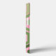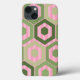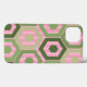 Den här telefonväskan har en geometrisk utformning av hexagoner i fyra skuggor av grönt på fält av rosa rand i två skuggor.