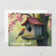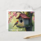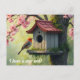 En rödhårig fågel vid ett fågelhus med plattor placerat i ett fladderbär i träd skapar en underbar ändring av adress vykort som är perfekt för alla som kärlekar fåglar, blommor och natur.