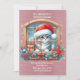 En söt kattunge tittar ut ett fönster som dekorerats till jul, med ett meddelande från mamma & pappa. Kortets baksida har också ett meddelande. Bakgrund är en glansig rosa papper