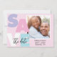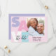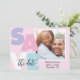 Mjuka pastellfärger kombineras för ett vår-, modernt, romantiskt "Spara datum"-kort. Framsidan av kortet visar parets foto omgivet av en vit ram. Texten "datum" sitter på "SPARA" i svart skrivstil. Baksidan av kortet är en solid, ljuslila, tom bakgrund.