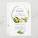 Könsneutrala baby-vår-babyduschinbjudan till påsk med handskriftstypografi av elegant med en söt duckande blöjning i en blomstrande lilly av daffodils.