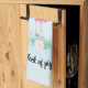 En kökshandduk med ett sött ordspråk: Var en flamingo i en duvflock. Designad med en illustration av att en mamma och baby rosa flamingo står på en säng av blommigt blommor med kula blommor med grönt handflatan träd i ryggen. Tropiskt och söt. Bakgrunden är en halvljusblå vattenfärg med lilans ledtoner.
