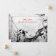 Elegant, nyckfull, färgrik blommig design med en söt vårfågel på grenarna av ett blommande träd, blommor, blomningar i röda, svarta, vita färger skapade med digital omarbetning av en antikt orientalisk miniatyr.
