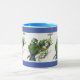 Fint bild av två små fåglar sitta på en gren med blommor finns på detta kaffe mugg med blå trim. Gör din morgon med mugg eller ge som gåva!