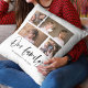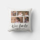 Kudde med orden "Vår familj" i ett stilfullt skrivsätt med 4 fotografier placerade sida vid sida på både framsidan och baksidan, totalt 8 bilder som du kan ersätta med dina egna fotografier mot en vit bakgrund. Du kan också lägga till ditt efternamn och det år då familjen bildades. Perfekt för heminredning, nygifta, familjeminnen, etc.