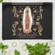 Den här vackra kökshandduken har en digitalt illustrerad folkkonst av en kvinna som vattnar ro. Bilden lyder: "Om varje blomma ville vara ro skulle vår förlora sin glans."
