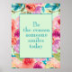 Cute och girly poster utskriften med inspirationstext, "Var anledningen till att någon leker idag" på en vacker, färglös, rosa, lila och korallfärgad blommigt och löv på en mint grönt.