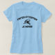 En blå t-shirt med en haj med Fransken Fungerar uppmärksamhet över den och jakande ord under den som kan översättas för att vara försiktig i bita