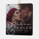 Denna moderna minimalistiska fotodesign för 'Vårt första julfirande förlovade' presenterar en bild som går ut över kanterna och överläggs med klassisk serif-texttypografi och parets namn med deras förlovningsdatum. Denna design är dubbelsidig.