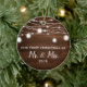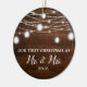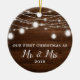 Vår första jul, mr och Mrs Helgdag Anpassningsbar Ceramic Ornament. Den här konstruktionen har en rustik träbakgrund med Mason burk string ljus.
